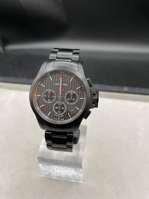 LONGINES - 42mm steel case with black dlc on black dlc steel bracelet. Complete with box and papers