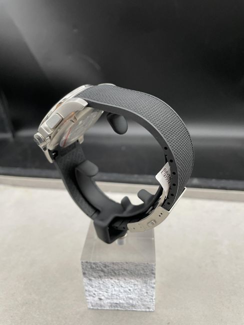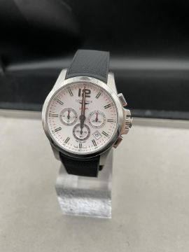 LONGINES - 44mm steel case with silver dial on black rubber strap with deployment clasp. With box and papers