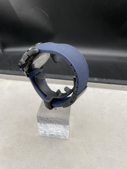 LONGINES - 44mm black DLC coated stainless steel case with blue dial and black ceramic bezel. On blue rubber strap with black DLC deployment. With Box and papers
