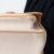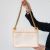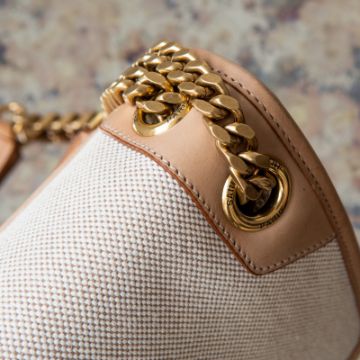 Sliding aged gold tone chain strap with leather insert for ease to carry on shoulder