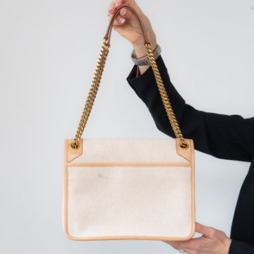 Canvas fabric,letter logo, front pocket with magnetic closure, gold tone hardware, contrast leather trim, interior is spacious with a zipped wall pocket and a slip pocket