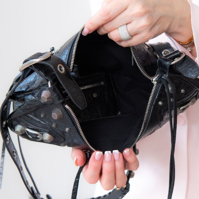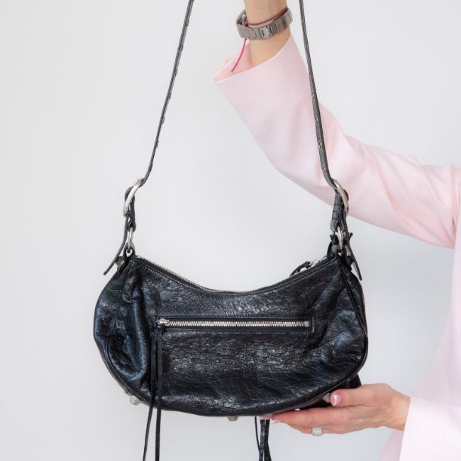 Carry crossbody or shoulder with an adjustable strap, interior has a zipped wall pocket.