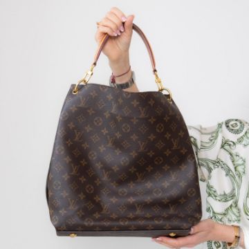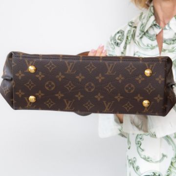 Oversized monogram shoulder or crossbody bag, gold tone hardware, removable leather top handle, optional long monogram leather shoulder strap with buckle adjustability.