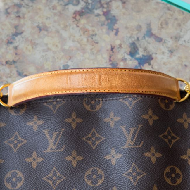 Preloved with some signs of wear at exterior side seam and leather top handle
