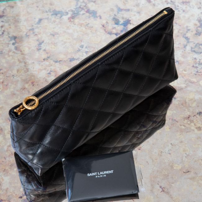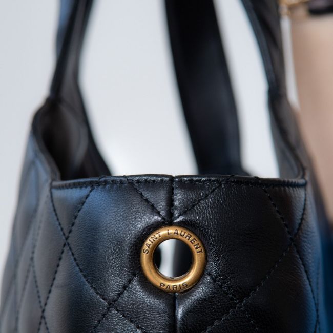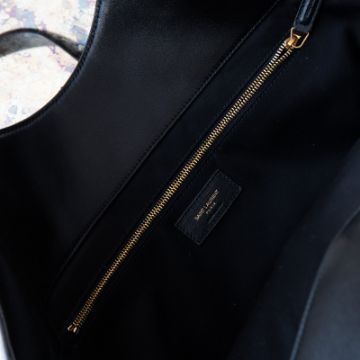 Light bronze tone hardware with iconic YSL logo on exterior, large interior features a main compartment, this bag can be carried wide or with closed sides..