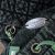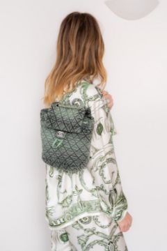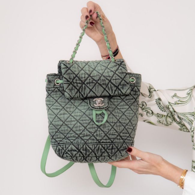Drawstring closure, silver tone hardware with turnlock detail, double leather straps with buckle adjustability to carry on back, additional silver tone hardware and green leather interweave chain strap. Interior features a slip pocket.